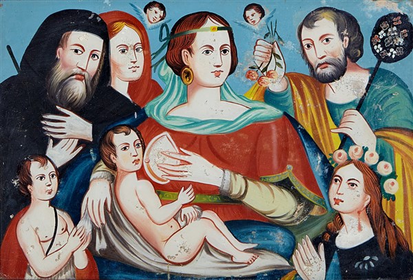 Scuola siciliana della metà del secolo XIX "Madonna con Bambino tra Santi" verre peint (cm 16,5x24) In cornice (difetti)