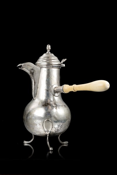 Cioccolatiera tripode in argento a corpo liscio, manico in avorio. Lombardo-Veneto, secolo XIX (h. cm 21) (g lordi 400)
