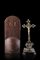 Crocefisso in metallo dorato sbalzato e inciso, decorato con cabochons in turch