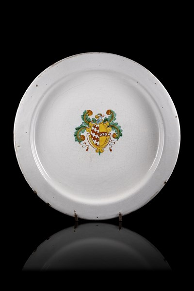 Manifattura di Deruta, fine secolo XVI. Piatto in maiolica smaltata bianca, decoro compendiario centrato dallo stemma della Famiglia Salviati Strozzi (d. cm 42) (difetti)