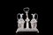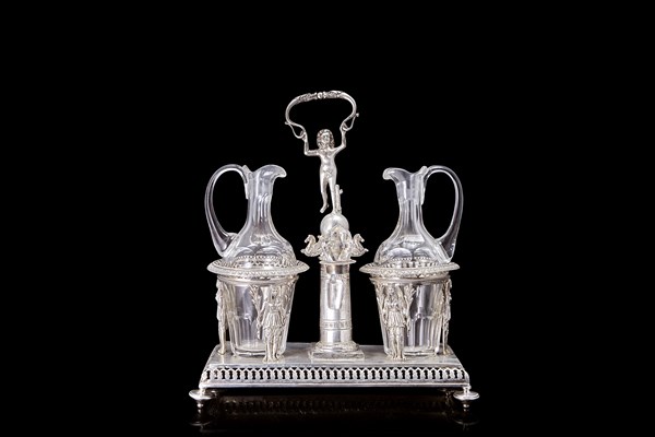 Porta olio e aceto in argento con fusto a colonna sormontata da figura alata a