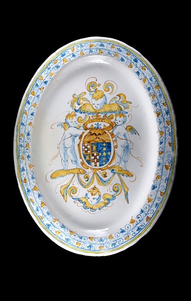 Manifattura di Faenza, seconda metà secolo XVI. Piatto ovale in maiolica di tipo compendiario centrato da stemma nobiliare tra putti e cherubini, falda decorata con girali di foglie e fiori (cm 42x32) (difetti)
