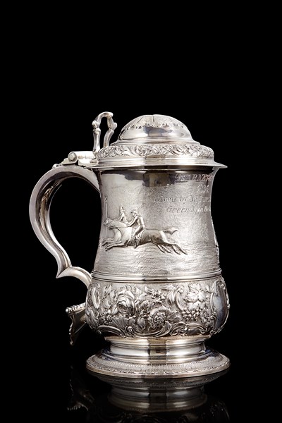 Embossed silver tankard decorated with equestrian motifs. Inscription reading: "Barnet Races 1836, given by Mr James Buckell , Green-Man-Hotel". London, 1757. Silversmith "CT WW" (h. cm 22) (g 960)
