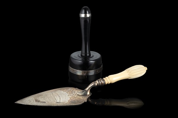 Set celebrativo in argento composto da martello in legno ebanizzato rivestito in argento e paletta cesellata e inscritta con dedica datata "21 giugno 1899" e presa tornita in avorio. Punzoni di Chester, 1897. Argentiere Hilliard & Thomason. In custodia originale in pelle impressa (lievi difetti)