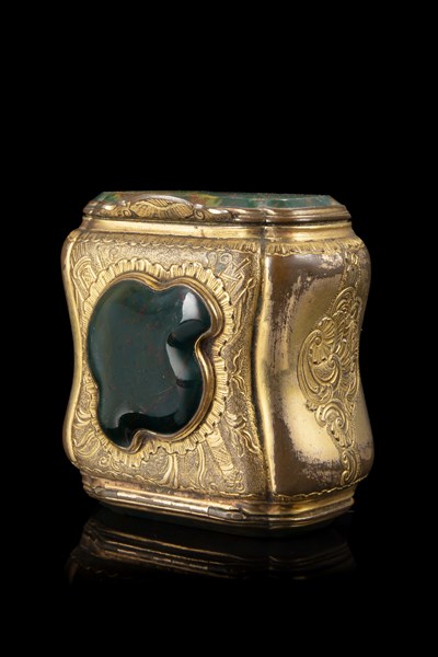 Scatola a due scomparti contrapposti con profilo mosso in rame cesellato e dorato e inserti in diaspro sanguigno. Secolo XVIII (cm 6,5x6,5x4)�� (difetti)