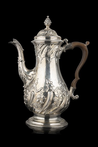 Caffettiera in argento a corpo piriforme sbalzato e cesellato a tralci fioriti. Presa del coperchio a pigna a tutto tondo, ansa sagomata in legno. Londra, 1768. Argentiere Charles Wrigh (h. cm 29) (g lordi 920) (lievi difetti)