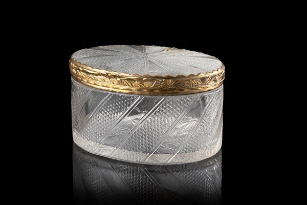 Scatolina ovale in cristallo di rocca scolpito con ghiera del coperchio in metallo dorato. Secolo XIX (cm 6x5x3,4)