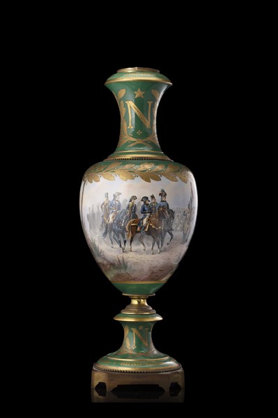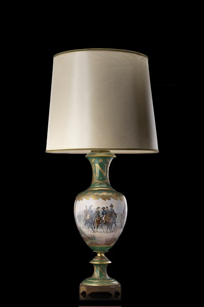 Manifattura del secolo XX. Base per lampada in porcellana decorata in policromia e dorature a scene napoleoniche (h. cm 74) poggiante su base polilobata in bronzo (lievi difetti)