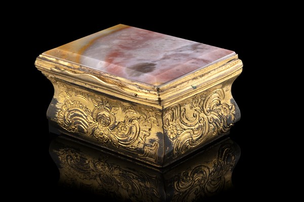 Scatola rettangolare in metallo dorato e cesellato con coperchio in agata. Secolo XIX (cm 6,7x5,1x3,6 ca.) (difetti)