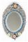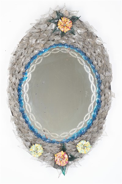 Manifattura di Murano, secolo XIX. Specchio ovale inciso a volute con cornice a doppio ordine in blu e incolore a foglie. Base e cimasa a fiori policromi (cm 87x56) (difetti e mancanze)