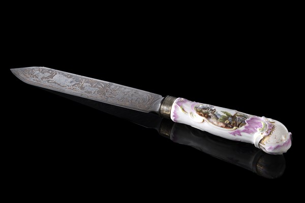 Manifattura di Meissen, seconda metà secolo XVIII. Coltello con presa in porcellana decorata in policromia a scene di caccia entro riserve a volute in rilievo. Lama in metallo inciso ad animali e cavaliere (cm 33,5) (difetti)