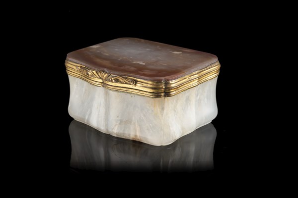 Tabacchiera sagomata in agata e quarzo con profilo e cerniera in metallo dorato