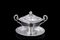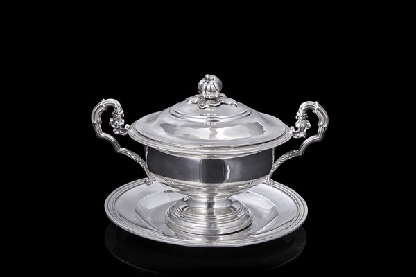 Tazza da puerpera con piattino in argento a corpo liscio, bordo scanalato, anse sagomate e presa del coperchio a frutto a tutto tondo. Piattino con iniziali incise. Punzoni francesi, secolo XIX. Argentiere Debain (piatto d. cm 18,3; tazza (cm 21x14x14) (g 530) (difetti)