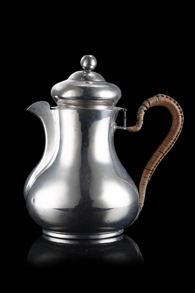 A silver coffe pot with wicker covered handle. Venice, first half of the 19th century. Silversmith Domenico Valente (h. cm 20) (g lordi 450)