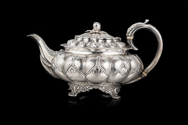 Teiera in argento a corpo bombato e costolato sbalzato a foglie e motivi fioriti, centrato da stemma. Presa del coperchio a frutto a tutto tondo, piedini a valva di conchiglia. Ghiere in osso. Londra, 1829. Argentiere George Burrows II (h. cm 15) (g lordi 710)