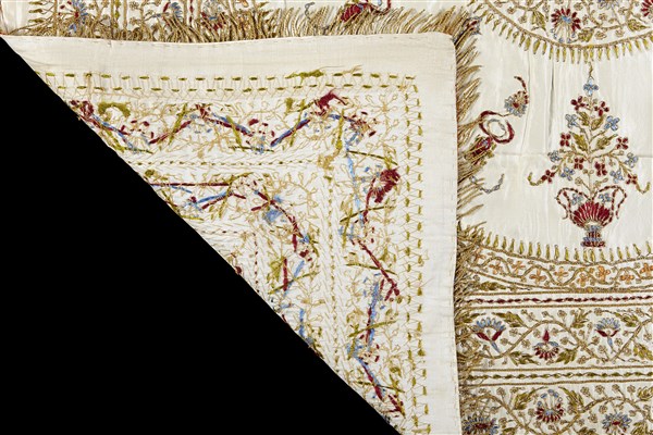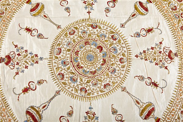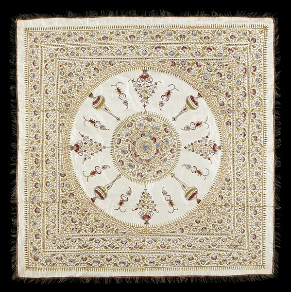 Tessuto copritavolo indiano, realizzato con un tessuto di raso di seta crema ricamato in seta policroma con applicazione di fili di metallo dorato. Motivo floreale con una riserva centrale tonda contenente acquamanili e vasi fioriti. Secolo XIX (cm 102x102) (lievi difetti)
