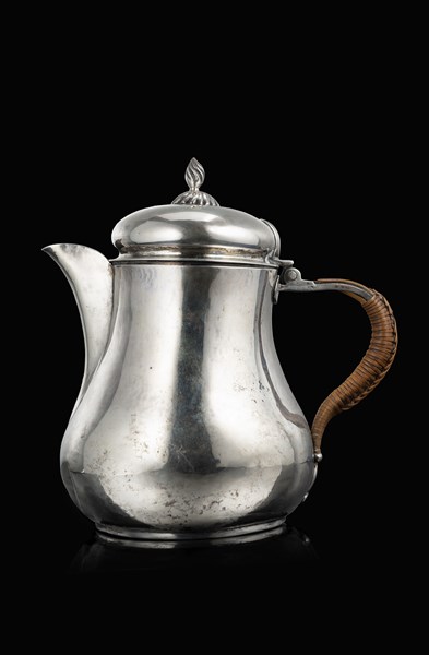 Caffettiera in argento a corpo liscio, presa a torchon, ansa mossa rivestita in vimini. Veneto, secolo XIX (h. cm 17) (g lordi 528) (difetti)