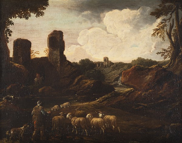 Paesaggio con ruscello, pastore, armenti e rovine sullo sfondo