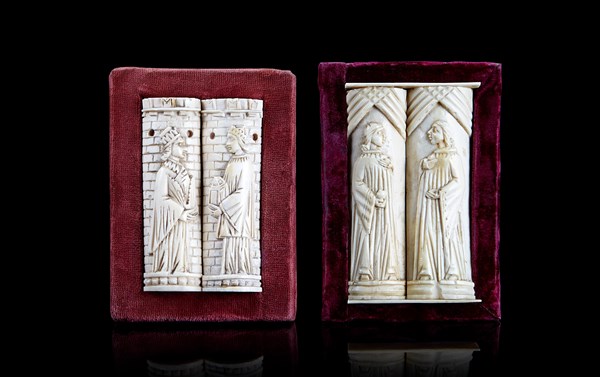 Due coppie di antichi fregi in osso intagliati a figure di regnanti e personagg