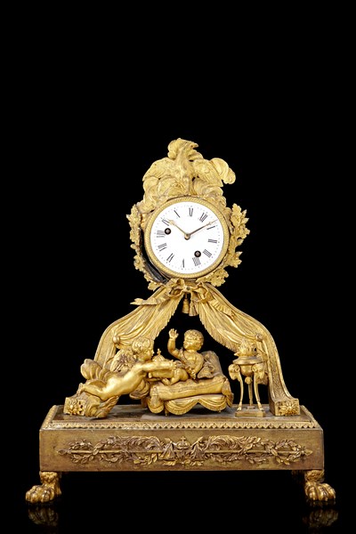 Ormolu mantel clock modelled in royal subject, probably recalling the apotheosis of the dauphin of France. Enamel dial with roman numerals (replaced). Chiselled golden brass hands. Weekly movement striking the hours and half (missing bell) France, end of the 18th century (h. cm 45) (defects and replacements)