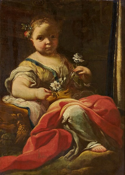 Scuola bolognese del secolo XVIII Ritratto di bambina con fiori Olio su tela,