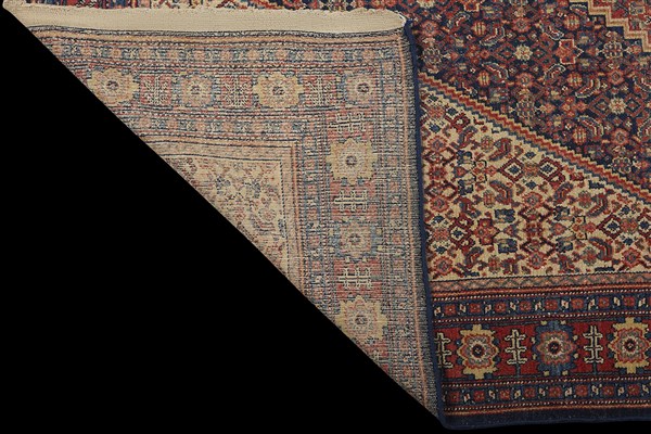 Tappeto Senneh, Persia, seconda metà del secolo XIX. Decoro con medaglione romboidale lanceolato a fondo mattone su campo blu notte decorato con motivo Herati. Grandi angolari a fondo bianco con motivo Herati e bordura principale Herati a foglie e fiori su fondo mattone. Conservate le due testate orginali (cm 194x140) (lievi difetti e rapature)