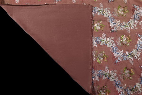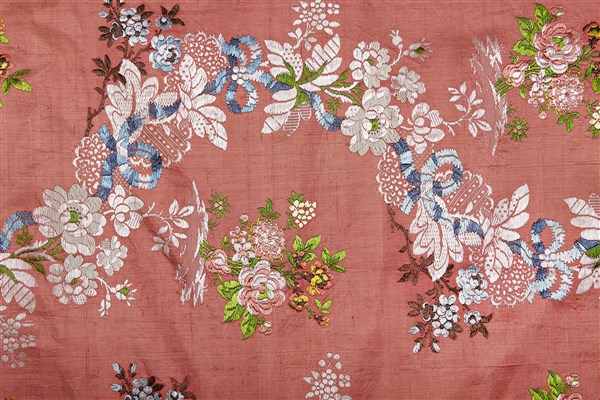 Tessuto lampasso in seta, Francia, Lione (?), secolo XVIII. Tessuto per abbigliamento in taffetà in seta color rosa antico con decoro spolinato a mano, con andamento a meandro composto da nastri, pizzi e mazzolini di fiori. Nelle riserve mazzi di fiori policromi su un campo stilizzato fluttuante (cm 251x242) (lievi difetti)
