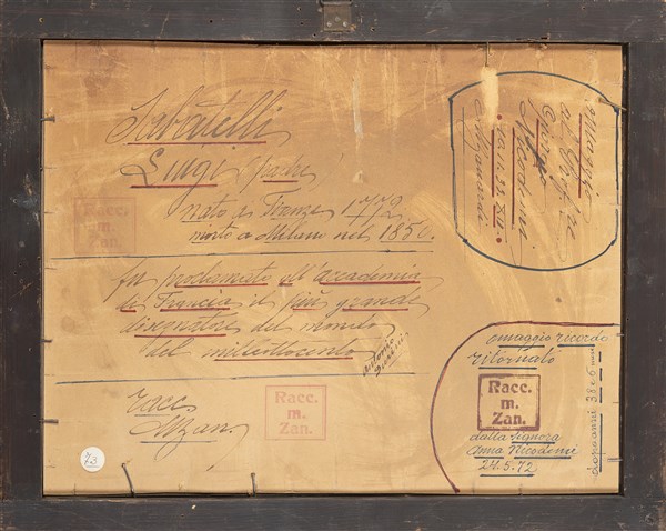 Al verso della cornice timbro "Racc / m. / Zan" e iscritto "Sabatelli / Luigi (padre) / nato a Firenze 1772 / morto a Milano nel 1850 / fu proclamato all' Accedemia di Francia il più grande disegnatore del mondo del milleottocento"; "Omaggio / al prof.re / Giorgio / Nicodemi / 10.11.33 XII / MZanardi" e "omaggio ricordo / ritornato / dalla signora Anna Nicodemi / 24.5.72 / dopo anni 38 e 6 mesi"