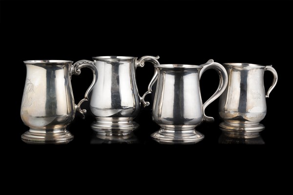 Lotto composto da quattro boccali in argento liscio con ansa mossa. Londra, secolo XVIII (h. max cm 13,2) (g 1370) (lievi difetti)