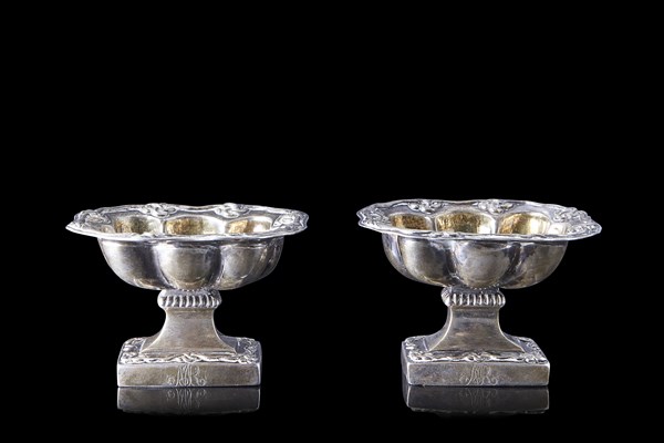 A 19th-century pair of silver saltcellars. Vermeil interior. Ciphered "MR" on the base. Naples hallmarks (h. cm 5,5) (g 230)