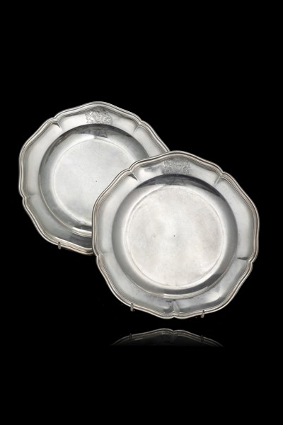 Coppia di piatti in argento con bordo mistilineo con inciso lo stemma dei conti