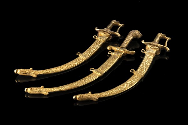 Lotto di tre daghe da presepe in metallo dorato. Secolo XIX