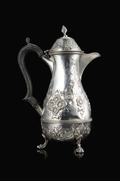 Lot 370 | Caffettiera in argento con corpo sbalzato a festoni fioriti, ansa in legno eban
