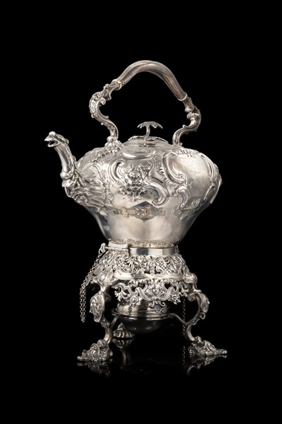 Samovar con sostegno e fornelletto in argento sbalzato e cesellato a girali e volute, presa del coperchio a fiore a tutto tondo, versatoio zoomorfo. Piedini in forma di mascheroni. Ghiere in osso. Londra, 1874. Argentiere Robert Harper ? (h. cm 43) (g lordi 2420) (difetti)