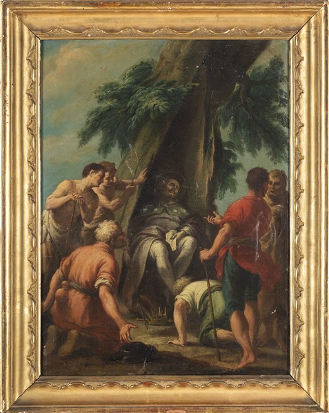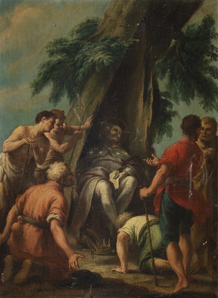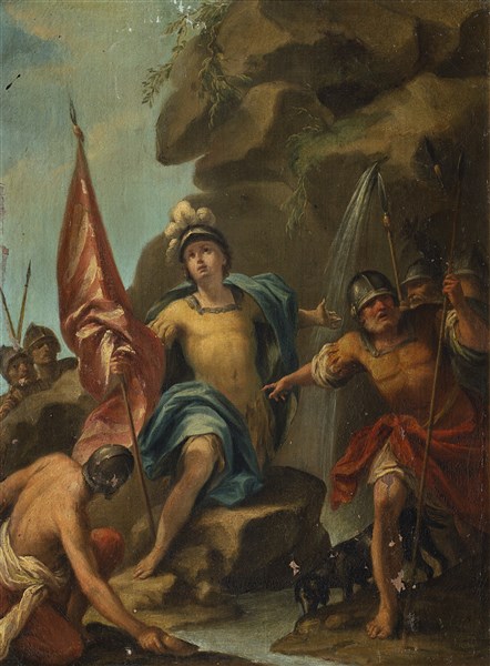 On the Miracle of Saint Venanzio label on the back: "(scuola bolognese) / Quadro rappresentante S. Venanzio nel mentre / che mancava l'acqua per li suoi soldati egli fa il / miracolo di farla scaturire dalla rupe originale / Del Varotti discepolo del Franceschini fioriva nel / 1760 quadretto di merito non comune / Già acquistato da Agostino Sala nel mese di / febbraio dell'anno 1871 in Bologna"
