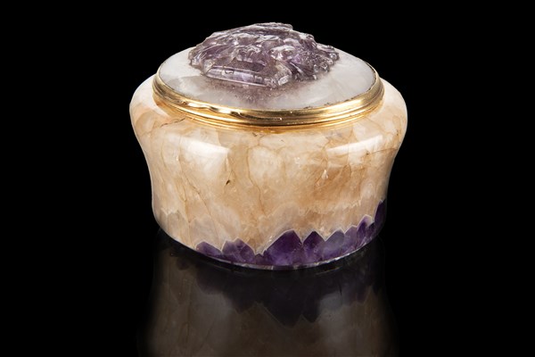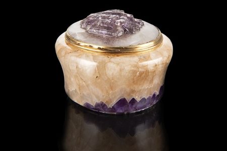 Tabacchiera in ametista scolpita sul coperchio con cesto di frutta e volatile. Profilo e cerniera in oro giallo. Dresda (?) seconda metà del secolo XVIII (cm 6x4x6) (lievi difetti)
