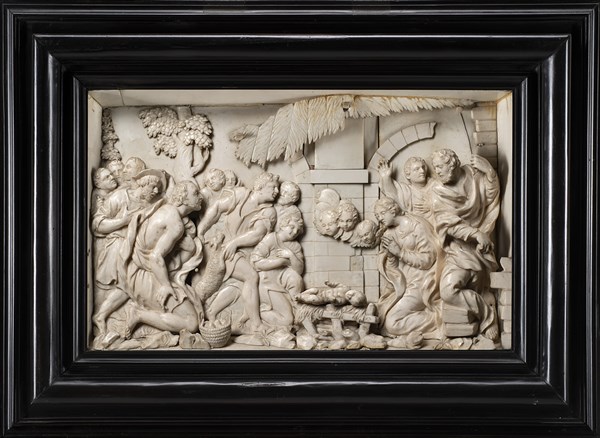 Arte tedesca, fine secolo XVII - inizio secolo XVIII "L'adorazione dei pastori" gruppo in avorio scolpito (cm 25x40) In cornice a cassetta in legno ebanizzato (mancanze e restauri)