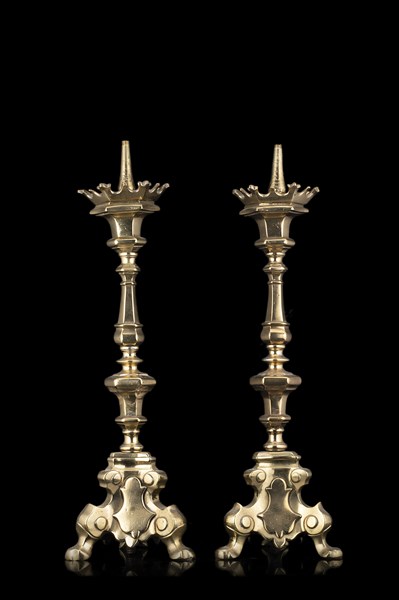 Coppia di portaceri tripodi in bronzo con fusto a balaustro e base a volute. Secolo XVIII (h. cm 53) (lievi difetti)