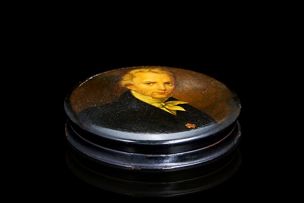 Tabacchiera circolare in legno laccato con coperchio decorato da ritratto di ge