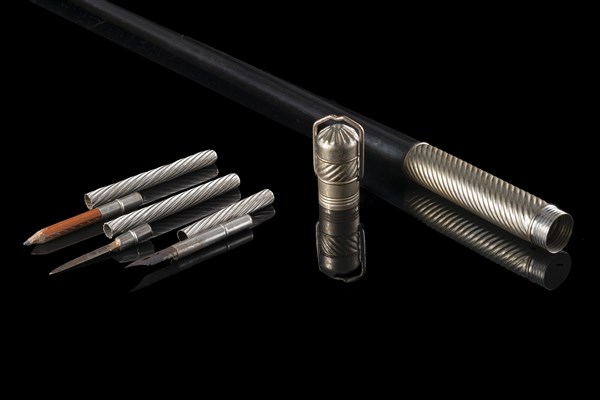An ebony walking stick with silvered metal handle enclosing a draftsman kit. Metal cap (L. cm 94)
