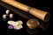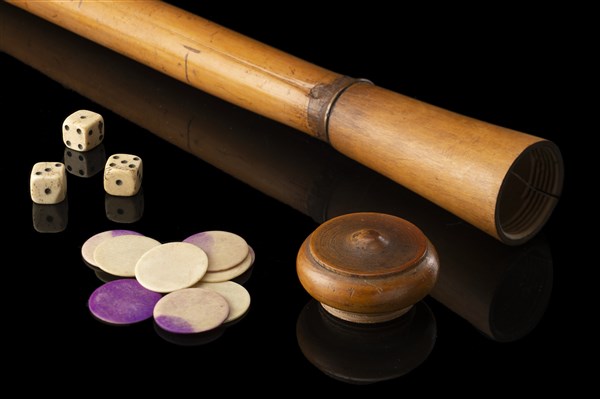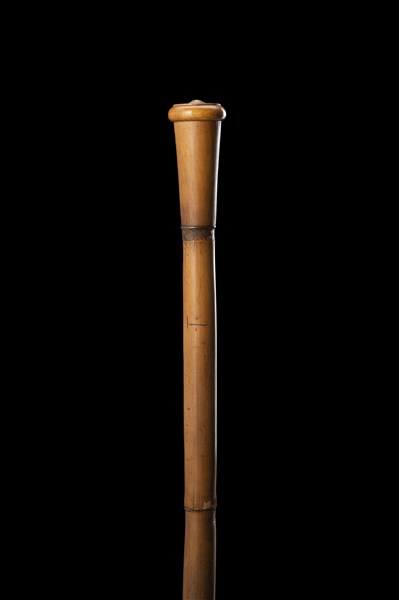 Bastone in bambù con pomolo celante dadi e fiches. Puntale in metallo. Secolo X