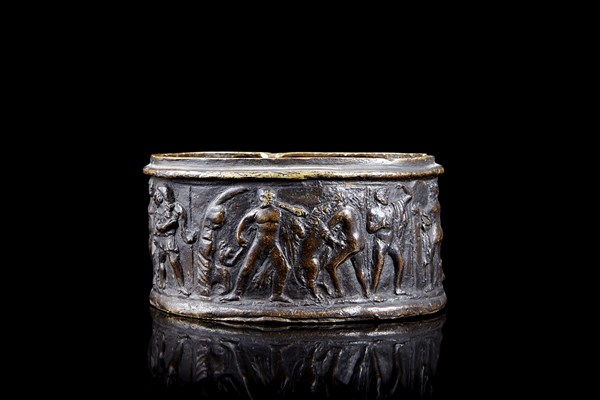 Lot 604 | Antica vasca in bronzo decorato a scene mitologiche (cm 6,5x12x9) (difetti)
