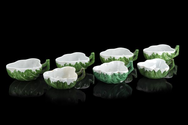 Manifattura del secolo XIX. Lotto di sette cremiere in porcellana bianca in forma di foglia, di cui tre dipinte all'interno in policromia a fiori (L. max cm 9) (difetti, una restaurata)