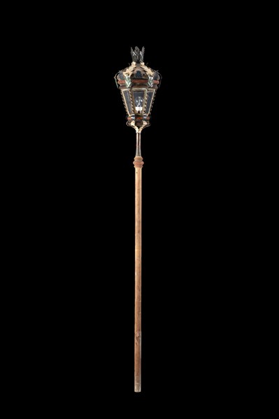 Lanterna in ferro battuto laccato e vetro decorata a foglie. Secolo XIX. Elettrificata in epoca posteriore (h. tot. cm 210) (difetti)