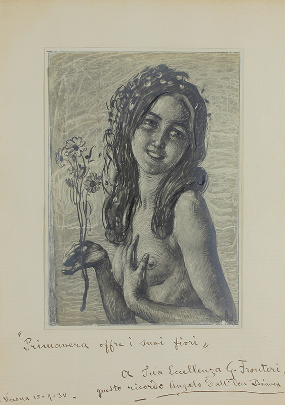 Dall'Oca Bianca Angelo Primavera offre i suoi fiori, 1930 tecnica mista su carta, cm. 54x39 firmata, datata ed intitolata in basso