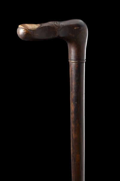 Bastone con richiamo per anatre in malacca con impugnatura raffigurante un dito