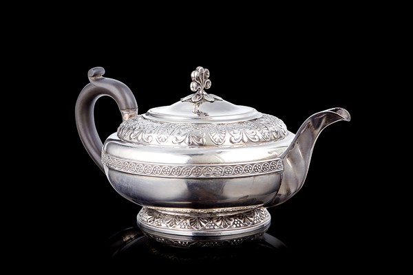 Teiera in argento sbalzato a volute e tralci vegetali, motivo concatenato nella fascia. Presa del coperchio a fiore stilizzato, ansa in legno. Londra, 1833. Argentiere Benjamin Smith II (h. cm 12,5) (g lordi 770)