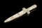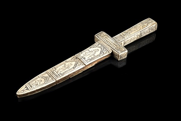 Tagliacarte da Congregazione. Fodero, guardia ed impugnatura lignee ricoperte completamente da tessere di osso inciso. Le raffigurazioni sono tutte inerenti a personaggi ecclesiastici. Sulla guardia è presente da un lato l'iscrizione "INUISSITIONE" e dall'altro "DOMENICANA". Lama leggera e losanga a doppio filo incisa in entrambi i lati con altre raffigurazioni ecclesiastiche. Nella parte terminale slabbrature. Europa, secolo XIX (L. cm 28) (mancanza nel fodero e segni del tempo)