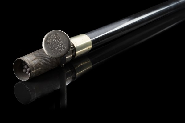An ebony walking stick with silvered metal handle enclosing a match box and engraved "Marbles Gladstone Mich. USA Pat'd 1900" (L. cm 91)