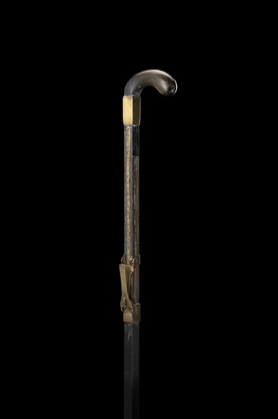 Bastone da calzolaio in ebano a sezione quadrata con centimetro e movimento per le misurazioni. Presa in corno. Inghilterra, secolo XIX (L. cm 100)